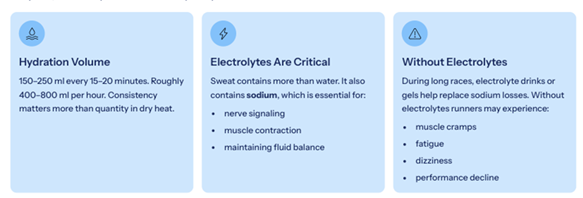 If hydration drops, cooling becomes less efficient and core temperature rises further, increasing fatigue and slowing pace. This is why races that feel manageable early can suddenly become difficult after 25-30 km.